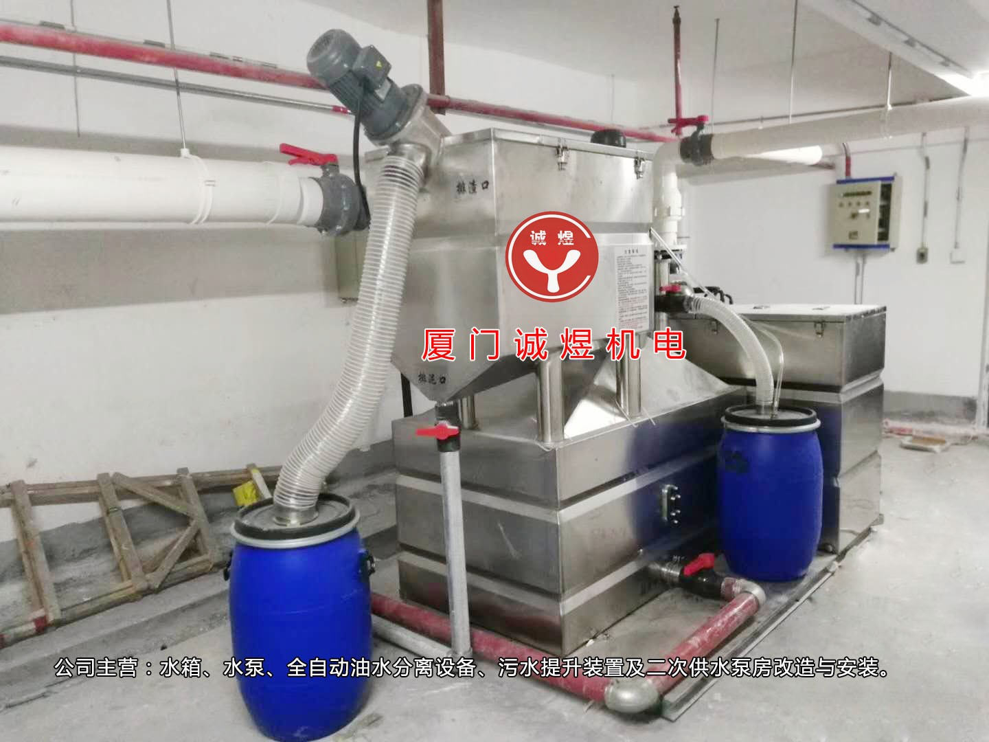 GY-T5系列隔油提升一體化設(shè)備整體結(jié)構(gòu)由三部分系統(tǒng)組成:除渣系統(tǒng)(自動(dòng)除渣或手工提籃除渣)、自動(dòng)除油系統(tǒng)以及污水提升系統(tǒng)。當(dāng)餐飲廢水流入第一隔離區(qū)(除渣區(qū))時(shí),除渣裝置將其中的固體雜物(如菜葉、米飯、碎骨頭等)截流并排出(或提籃式除渣,由人工傾倒);進(jìn)入第二隔離區(qū)(除油區(qū))后利用油和水的比重差及箱體內(nèi)部的結(jié)構(gòu)設(shè)計(jì)將水、油在箱體內(nèi)進(jìn)行物理分離分層,廢水中的油珠沿?cái)_流板集聚向上運(yùn)動(dòng),聚集漂浮在除油系統(tǒng)頂部集油器內(nèi),用戶通過(guò)集油器上的油窗視鏡觀察油量,油量較大時(shí)打開(kāi)排油閥門(mén),將廢油排至集油桶,定期清理或更換(可選配自動(dòng)排油系統(tǒng)實(shí)現(xiàn)自動(dòng)排油,選配稱重報(bào)警系統(tǒng)實(shí)現(xiàn)集油桶清理報(bào)警通知,選配氣浮裝置實(shí)現(xiàn)油水加速分層)。除渣系統(tǒng)和除油系統(tǒng)經(jīng)處理后液體中較小雜物在重力作用下沉淀與設(shè)備底部的排泥區(qū)域中,通過(guò)管道定期排放完成清理;油水分離后的廢水沿?cái)_流板向下流動(dòng),進(jìn)入第三隔離區(qū)(污水提升系統(tǒng)),通過(guò)污水提升泵強(qiáng)排至市政管網(wǎng)(設(shè)備安裝位置高于市政管網(wǎng)的,可以選擇不配污水提升系統(tǒng),污水通過(guò)管路直接流入市政管網(wǎng))。設(shè)備集合國(guó)內(nèi)外先進(jìn)技術(shù),通過(guò)自動(dòng)出渣排法+重力分離法+回廊式和虹吸式排水+浮油設(shè)置相結(jié)合,廢水通過(guò)5-8級(jí)深度處理,油水分離效果優(yōu)于國(guó)家三級(jí)排放標(biāo)準(zhǔn)。